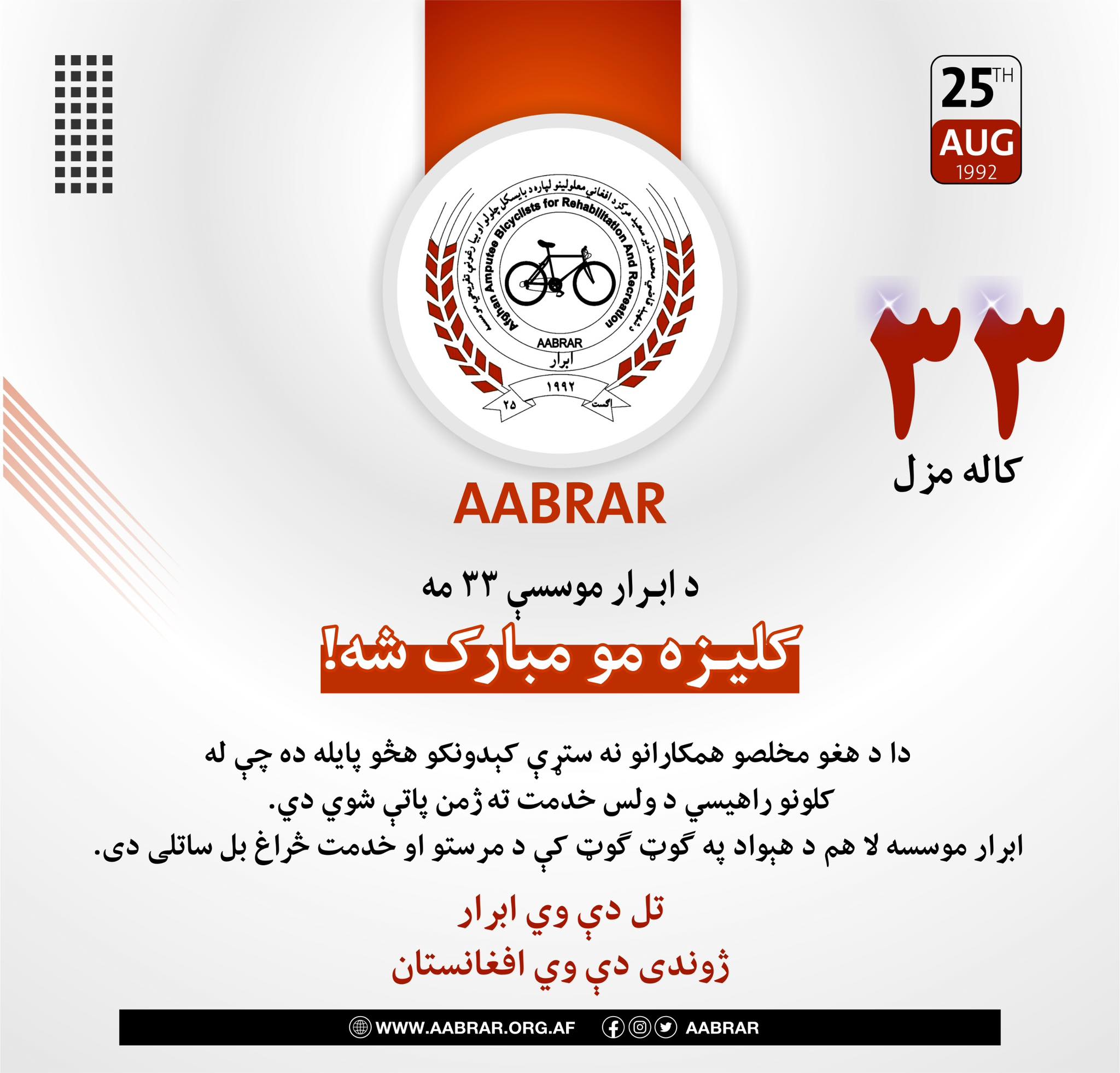 د بیارغونې او تفریح لپاره د افغان امپوټي بایسکل ځغلوونکو ټولنه (AABRAR) یوه افغان غیر دولتي، غیر سیاسي او د انتفاعي موسسې څخه ده چې د معلولیت لرونکو اشخاصو او نورو زیان منونکو ډلو ټولنیز، مدني او اقتصادي ادغام او همدارنګه ټولنیزو او اقتصادي برخو ته وقف شوې ده. په افغانستان کې د مدني ټولنې پراختیا. په 1992 کې تاسیس شوی، د AABRAR لومړنۍ رسمي خدمت د بایسکل روزنې پروګرام و، دا ډول لومړنی روزنه چې په افغانستان کې د معلولیت لرونکو اشخاصو سره د دوی د حرکت او د کار ځایونو ته د بایسکل چلولو کې مرسته کوي چې د دوی د روغتیا په ښه کولو کې دوه چنده اغیزه درلوده. شرایط او د...